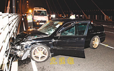 事發昨晨4時30分,肇事私家車沿新汀九橋駛向元朗,至橋中央失控,撞向橋邊鋼索欄,再「V」字形反彈,衝越4條行車線猛撼橋中欄河,車頭毀爛不堪,梁及兩名女乘客受傷被困,由途經司機協助報警。消防員接報到場,先後將3名傷者救出送院;由於司機未能進行酒精測試,警方正就意外原因展開調查。