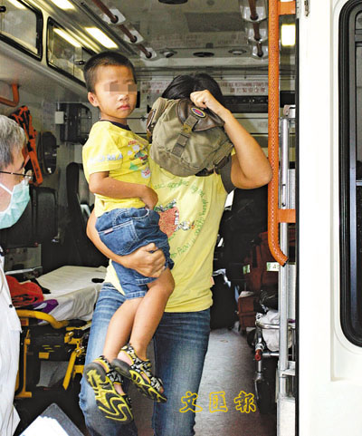 ■雙腳一度被夾在欄杆內的頑童由消防員救出送院。 本報記者蔣焯文 攝