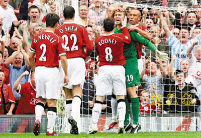 ■曼聯門將古斯錫勇救12碼後接受隊友祝賀。美聯社