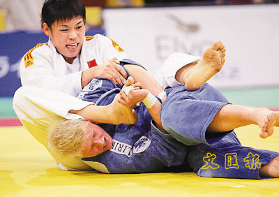 ■中國選手劉霞(白衫)將對手壓在腳下。 法新社