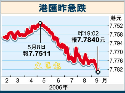 港匯繼續轉弱,美元兌港元升至7.7845港元,比上個交易日的收市7.7827港元,跌18點子,是港元兌美元的15個月低位。外匯業人士表示,美元現時在全球均表現強勢,加上因為認購新股,令熱錢源源不斷流入本港,而有關的熱錢卻轉存美元,以求在港元及美元之間套息獲利,令一個月拆息跌穿4厘,港匯也創一年多的新低。