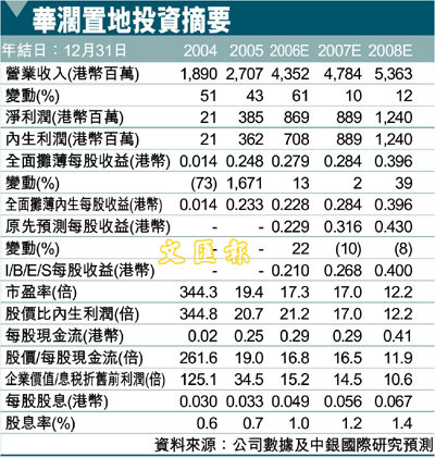 考慮到政府緊縮政策使得明年完工計劃放緩,我們將華潤置地(1109)07、08 年盈利預測分別下調10%與8%。由於06 年上半年重估盈餘1.93 億人民幣,我們也將06 年全年盈利預測上調22%,但維持內生利潤預測。考慮到其潛在資產注入、預計全年增長迅速以及強勁經常性收益等因素,華潤置地仍然是我們在該板塊的首選股票之一。我們認為儘管短期上漲空間可能較為有限,但是對長期投資者而言,現在正是吸納該股的好時機。該股股價較淨資產值折讓15%,我們對該股維持同步大市評級。