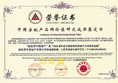 【本報訊】新世界中國地產(0917) 於上周六在北京由「中國房地產TOP10研究組」所發佈名為「2006中國房地產品牌價值」的內地房地產企業品牌價值研究報告中,獲評為「2006中國房地產行業領導品牌」,在所有香港及海外發展商裡按品牌價值名列首位。