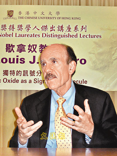 路易斯.歇拿奴是首位發現一氧化氮能協助男性「重振雄風」的科學家,其發現造就了陽痿藥「威而鋼」的面世,從此一舉成名。他接受中大及新鴻基地產之邀,昨日以「一氧化氮:獨特的訊號分子」作專題講座,吸引了300人到場。他指可能受當船匠及木匠的父親所影響,自己小時候很愛將東西裝裝拆拆。有一天他決定將屋內的掛牆鐘「分屍」,零件散滿一地,其母見狀嚇得尖叫,其後勒令他要將掛鐘還原,結果他真的將鐘「化零為整」,而且還能正常運行。自此以後他便將自己的家當作實驗場,無論是玩具、摩打還是小機器也難逃他的「魔掌」。