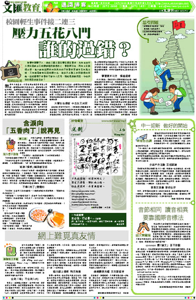 不少人認為,學校教育以學術知識作為主導,對於情緒處理的教育卻欠奉,然而影響學生一生的可能是情緒教育。早前,一名待業的應屆會考生跳樓身亡,正是與他不懂處理情緒問題有關。由於一次的手術錯誤,導致他背部長期彎曲,在這個以貌取人的社會,難免受到各方歧視,亦因此養成了他自卑的性格。作為新移民,他亦一時未能跟上香港的學習模式及進度,會考成績未如理想,即使畢業個多月亦未能尋獲工作,加上家中經濟狀況欠佳,種種的不如意事令他作出了輕生的決定。儘管我們明白向別人傾訴是解決抑鬱的最好方法,然而當局者迷,又有誰能如此清醒?除了老師要關心學生的情緒問題外,身為同學的一分子又是否需要學習接納、了解同學的不同個性?儘管書本上沒有一套的交際秘笈供人學習,但這是否我們最需要學習的知識呢?
