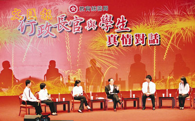 ■曾蔭權與2000多名中學生,在伊館進行真情對話。本報記者曾慶威 攝
