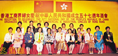 【本報訊】(記者 鄭群)香港工商界婦女昨假尖沙咀洲際酒店,舉行慶祝中華人民共和國成立57周年酒會。邀得中聯辦特邀顧問陳鳳英,外交部駐港特派員呂新華夫人呂張靜婭蒞臨主禮,酒會廣邀各國駐港領事、政界、商界、各社團友好以及廣東省、澳門各婦女團體代表蒞臨,賓主近400人歡聚一堂,同賀祖國生日。