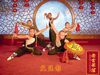 北京老舍茶館每天晚上的壓軸節目少林功夫秀讓人們可以真正零距離地接觸中國少林功夫,親臨其境,一睹少林功夫的風采。十幾分鐘的表演絕對可以讓場內的觀眾HIGH到頂點。老舍茶館場內的鎂光燈效果,使功夫秀更有視覺衝擊力。而整個茶館京味十足的古風,讓人們幾乎忘了自己所處朝代,看著一套套少林功夫上演,仿佛時光倒轉。
