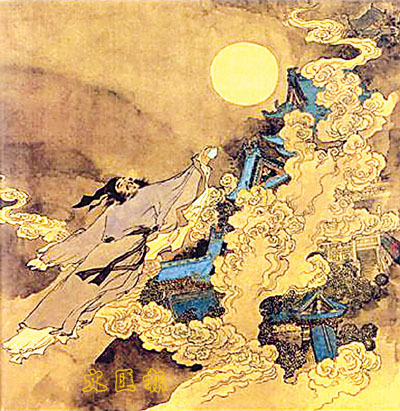 唐人張讀在《宣室志》裡就寫過這事。說有位擅長道術的周生,在客人齊至的中秋之夜,拿了幾百根筷子,用繩子編成梯子,登到天上,不一會,天就黑了,月亮沒了。再過了一會兒,他從天上回到地上,掀起衣服,露出月亮的一角,滿屋子立刻亮如白晝,寒氣侵入在場的每個人的肌骨。