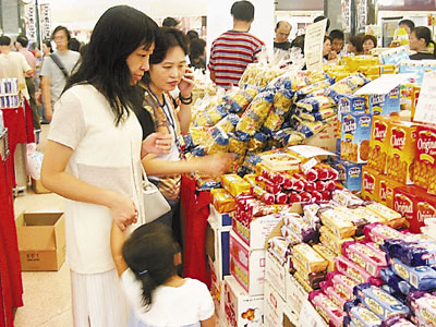 ■中國質檢總局近期檢查出來自日本的食品含有危害人體健康物質。圖為內地民眾在選購日本食品。 資料圖片