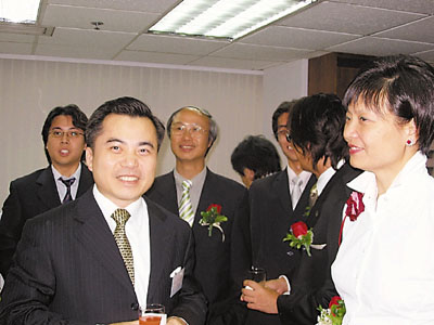 ■黃仁龍到場恭賀公民黨總部開幕,黨魁余若薇(右)出來迎接。本報記者郭曉樂 攝