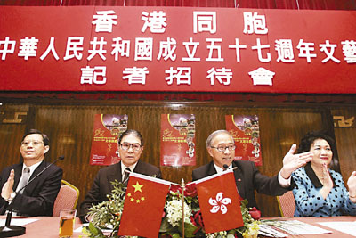 ■香港同胞慶祝國慶籌備委員會(國慶籌委會)籌辦的國慶文藝晚會,將於10月1日晚在紅磡香港體育館舉行。圖為籌委會秘書長胡經昌(右二)等在記者招待會上。本報記者劉國權 攝