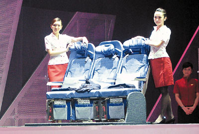 ■漂亮的國泰空姐展示全新的機艙座椅。本報記者 陳朗昇 攝