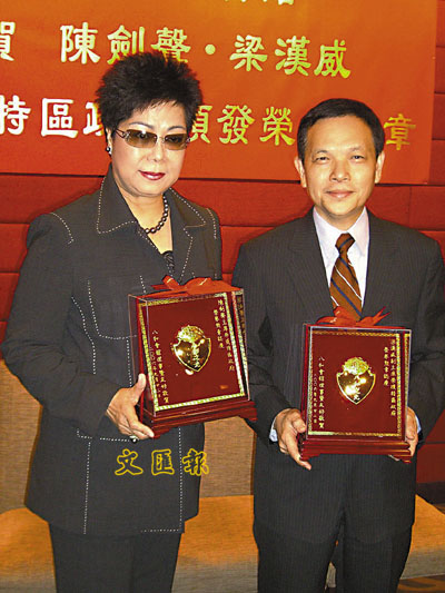 ■「八和」會員給陳劍聲與梁漢威贈送「八和之光」的大金牌,以資慶賀。