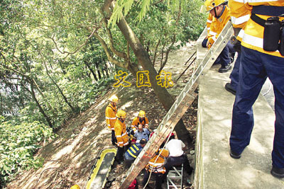 【本報訊】司徒拔道玫瑰新h一名63歲姓何維修工人,昨在A座對開擬爬下2.5米下山坡修理水管及電線時,不料突告失足墮下,當場扭傷左腳不能動彈,幸傷勢並不嚴重,大叫救命,結果驚動工友報警,由到場消防員救起送院敷治。