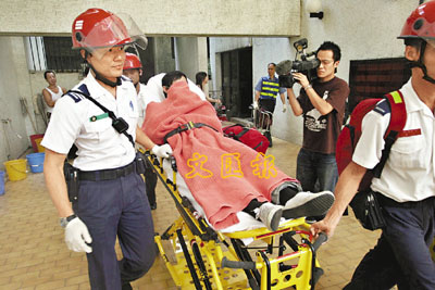 【本報訊】一鄭姓35歲水渠維修工人,昨在康福台4號康明苑33樓天井外牆修理渠管時,另一工友由對上數層的天台位置吊下工具及渠管,不料中途其中一截8吋長的鐵管鬆脫墮下,剛好擊中鄭的左手臂,結果受傷被困,需由消防員游繩而下救上天台送院敷治。
