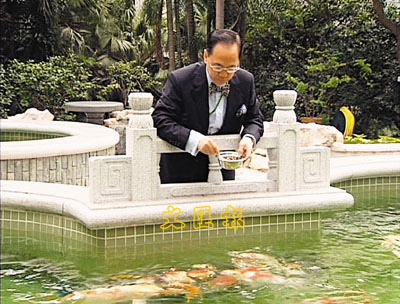 ■曾蔭權表示,每日都要為心愛的錦鯉餵食,還會吹口哨給牠們聽。 資料圖片
