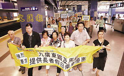 民建聯沙田支部昨天到馬鐵車站及列車上請願,要求提供長者假日車資2元優惠,讓大部分長者在假日可到港九各地遊玩。 本報記者曾慶威 攝