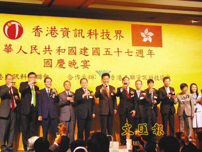【本報訊】(記者 喻淑琴)香港資訊科技界日前假香港洲際酒店,舉行中華人民共和國成立57周年盛大聯歡晚宴,筵開63席,800名嘉賓出席。晚宴由中聯辦副主任李剛、工商及科技局常任秘書長何宣威主禮。