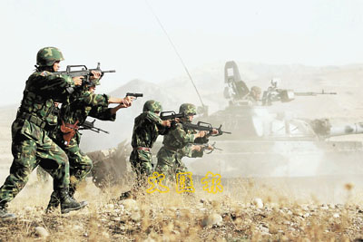 ■23日,在塔吉克斯坦哈特隆州穆米拉克訓練場進行了中塔兩國武裝力量聯合反恐軍事演習。這是中方突擊隊隊員在塔方坦克掩護下搜索前進。 新華社