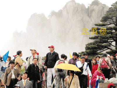 ■遊客冒雨觀賞雲霧飄渺的黃山風光。資料圖片