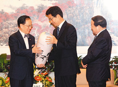 ■行政長官曾蔭權接受湖南省省委書記張春賢致送紀念品。右為湖南省長周伯華。