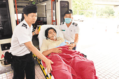 ■內地婦在東鐵大學站的女職員協助下順利產子後,抱著兒子(箭嘴)由救護員送院,母子平安。