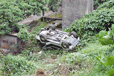 【本報訊】大埔林錦公路昨午發生驚險交通意外。一名車房少東駕駛四驅車轉彎時疑因避狗失控,衝落30米下山坡,四輪朝天,司機僅受輕傷。由於今次已經是10日內同一地點發生的第2宗車禍,加上墮下的車輛僅差約20米便撞入民居,故有住客希望政府可在路面加裝鐵欄,以防再有車輛墜山。