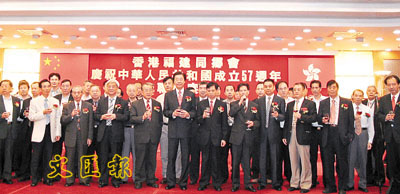 ■香港福建同鄉會舉行慶祝國慶57周年聯歡晚會, 賓主在台上敬酒。本報記者沈清麗 攝