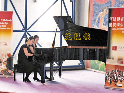 香港演藝學院轄下的音樂學院昨日舉行了本學年的獎學金頒贈儀式,共有六名學生得獎。另外,去年三位得獎者由於表現優異,亦續獲獎學金。圖為獲得獎學金的孿生姊妹周樂娉及周樂婷演奏名作曲家比才的《木馬》娛賓。