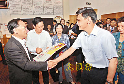 曾特首及夫人曾鮑笑薇,與特首辦主任曾俊華等今早參觀了湖南省體操館。一行人剛踏進場館,已獲大批小運動員熱烈拍手歡迎,有代表隨即送上鮮花,又在煲呔耳邊「密密斟」,逗得他樂得開懷。煲呔又與3名奧運金牌選手會面,言談甚歡。