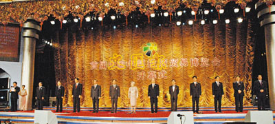 ■第一屆中博會在長沙開幕,吳儀副總理居中,全國政協副主席徐匡迪、原全國政協副主席毛致用、香港特首曾蔭權、澳門特首何厚鏵、商務部部長薄熙來及中部六省省長等12位領導分立兩側。 本報長沙傳真