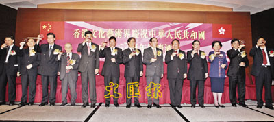 【本報訊】(記者 郭曉樂)香港文化藝術界昨日舉行慶祝中華人民共和國成立57周年酒會。主禮嘉賓包括國家文化部副部長常克仁、外交部駐香港特派員呂新華、中聯辦副主任王鳳超、特區政府民政事務局局長何志平、中聯辦秘書長趙廣廷、宣傳文體部部長張延軍、國家文化部港澳台司司長李冬文、香港特區行政會議召集人梁振英、身兼立法會議員的中國香港奧委會會長霍震霆、大會主席團主席莊世平等,並有近1000位文化藝術界精英知名人士、多國駐港領事館領事及文化事務官員雲集會場,場面熱鬧。
