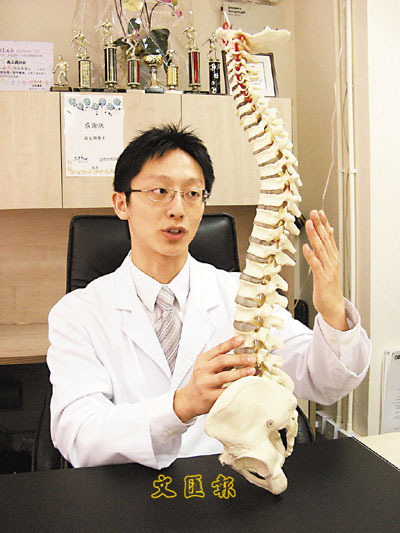 ■溫文灝指學童長期姿勢不良及背過重的書包,會影響脊骨健康。 本報記者歐陽杏櫻 攝