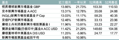 佔近三個月以來榜首的恆昇環球新興市場基金,基金在2003、2004和2005年表現分別為71.87%、35.31%及17.93%,基金標準差為21.21。地區分布為42.65% 已發展亞洲 、15.26% 新興亞洲、13.47% 非洲/中東、10.19% 新興歐洲、8.35% 拉丁美洲、5.69% 北美、2.3% 英國、1.56% 澳大利亞及 0.52% 已發展歐洲 。