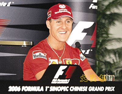 【本報上海新聞中心記者章蘿蘭28日電】「千呼萬喚始出來」的米高舒麥加今天終於首次公開亮相。對於即將到來的F1中國站比賽,「車王」坦言,目前最大的競爭對手只有他自己。此外,為了破除上賽場必敗的「魔咒」,「車王」還特意在頭盔上印上漢字,希望能為是次中國站的比賽帶來好運。
