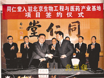 2001年,北京同仁堂入駐北京生物工程與醫藥產業基地項目的簽約儀式。