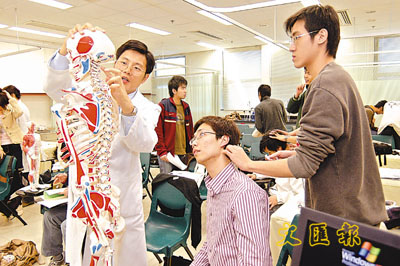 香港各大學中醫學院設備完善,對學生學習各項中醫應診方法有著一定有幫助。(圖為香港浸會大學學生在學習針灸)