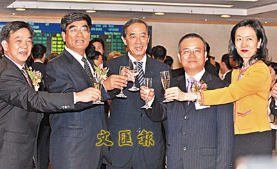 ■中海化上市,傅成玉(左二)、聯交所主席夏佳理(中)、吳孟飛(右二)等祝賀上市成功。
