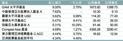 佔近三個月以來榜首的GAM 太平洋基金,基金在2003、2004和2005年表現分別為35.92%、22.99%及27.23%,基金平均市盈率和標準差為22.39及21.21。