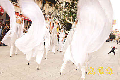 ■在街上跳得如此賣力的,是法國里昂當代舞蹈節的一班舞蹈員。 (法新社)