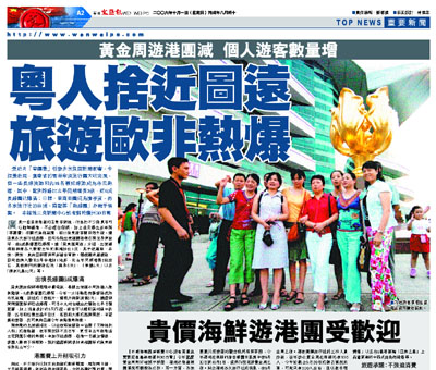 受近月「零團費」引發多宗負面新聞影響,今個黃金周,廣東省的香港常規旅行團大吹淡風,但一些長線旅遊和內地各種短線遊成為市民熱選,其中,歐洲路線比去年同期增長3倍,近6成長線團已爆滿;日韓、東南亞團成為搶手貨,而多家旅行社的非洲、南歐等「熱線團」亦幾乎售罄。 本報珠三角新聞中心記者解玲廣州30日電