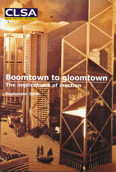冰川溶解不但癱瘓港島金融中心,添馬艦新政府總部也難逃一劫,西九龍的填海區、香港文化中心也難逃水淹,淹浸範圍北至旺角朗豪坊才止步。在里昂證券最新發表的研究中,封面更以水浸金融中心,帆船在中銀大樓前經過的虛擬圖片,形象化顯示全球溫室效應對本港經濟造成的重大打擊,交通運輸全面癱瘓。