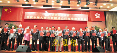 【本報訊】(記者 鄭群)香港海南商會於國慶日假尖沙咀龍堡國際賓館胡應湘堂舉行聯歡晚宴,隆重慶祝中華人民共和國成立57周年,筵開51席,600多人歡聚。晚會上,國慶籌委會主席、海南商會會長李運強率全體賓主引吭高歌,台上台下合唱一曲《歌唱祖國》,雄壯的歌聲為晚會揭開序幕。當晚賓主濟濟一堂,同心祝願祖國更加繁榮富強,場面歡樂熱鬧。