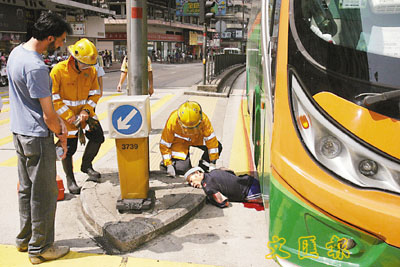 【本報訊】一年約70歲、頭纏白毛巾仿似神風敢死隊打扮的男子,昨匿在一輛中港直通巴士車底闖境來港圖進行非法行乞;其「乘坐」的直通巴經逾40分鐘車程,在佐敦道首站停車後再開行時,適遇燈位及交通擠塞再停車,疑有人誤會已抵總站,離開車底圖爬落馬路時,直巴突然開行,他在無法閃避之下,慘遭直巴拖行逾百米,現場遺下一條長長的血路。途人驚睹意外,狂拍直巴的車身大叫「停車」,疑司機正埋頭傾手機,肇事後仍懵然不知,至傷者被救出時已血肉模糊,送院後不治。