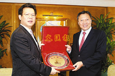 ■中山市常務副市長彭建文於基金成立協議簽署儀式上,致送紀念品予郭氏基金主席郭炳湘。