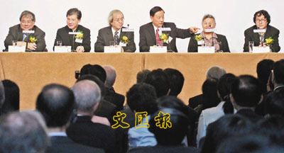 ■浸大「金禧論壇:創意之道」,徐冰(右起)、鄭小瑛、吳清輝、王杏慶、羅康瑞、陳長謙分享心得及看法。 本報記者梁祖彝 攝