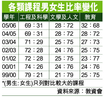 各類課程男女生比率變化 (圖)