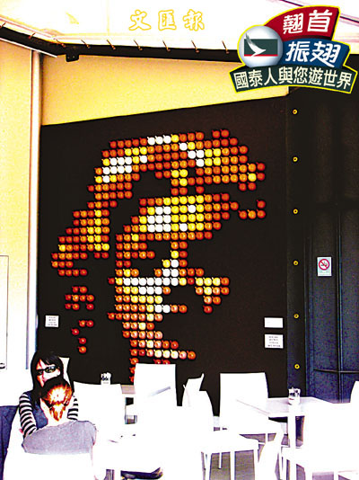 這咖啡館不很大,從門口看進去,已看到以黑白為主調的裝潢,簡潔、寧靜,跟藝術館的優雅氣息好不配合。本來看似普通的咖啡館,牆上卻掛著一幅以咖啡杯砌成的立體畫,蠻特別的,馬上把它拍下來。