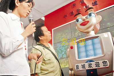 ■在第3屆中國(濟南)國際信息技術博覽會上,機器人「童童」與參觀者對話。 本報記者崔健 攝